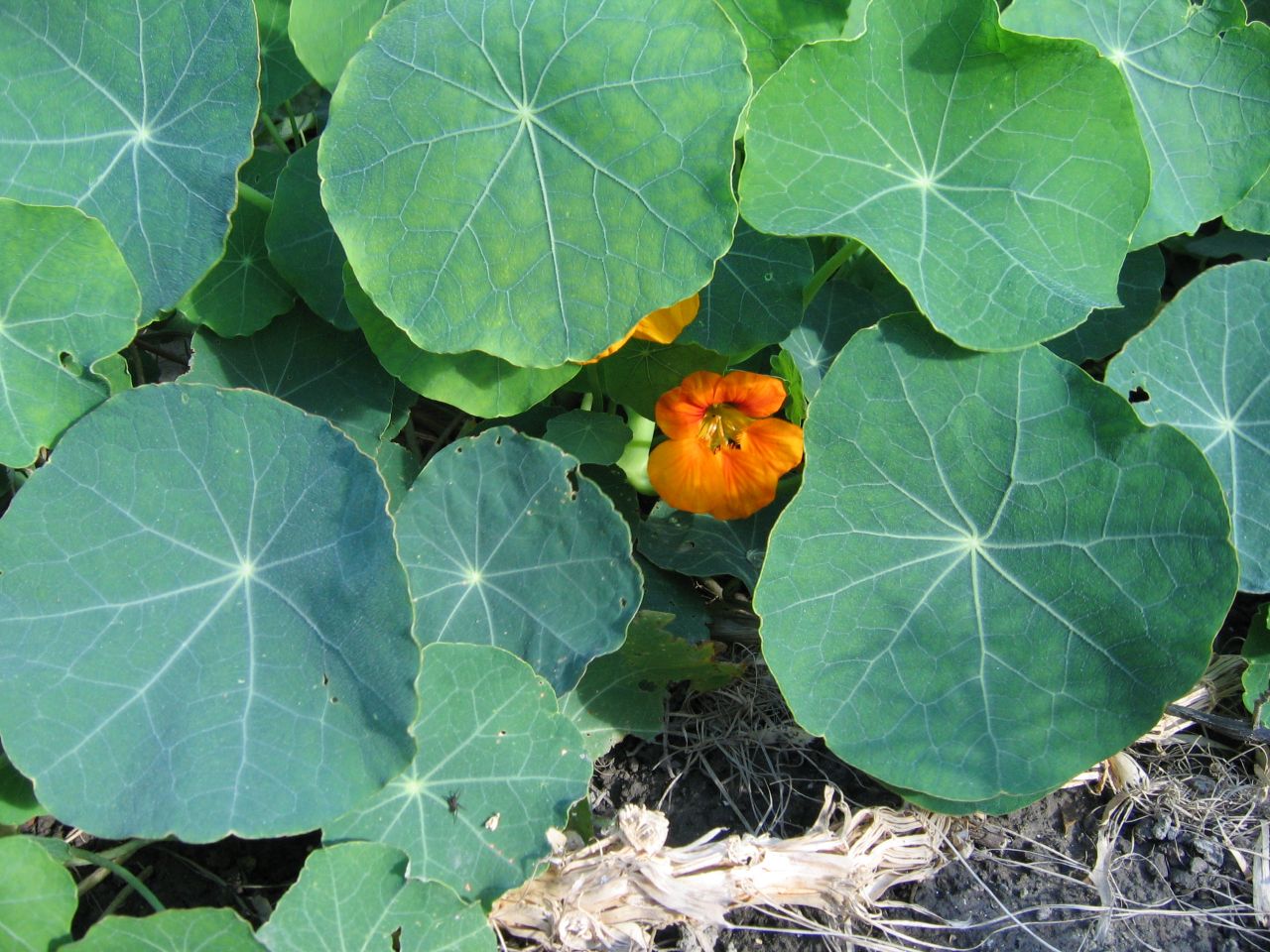 Sarkantyúka (Tropaeolum majus): Talajtakaró, heverő szárú növény. A levelei, a virága, a zsenge termése is ehető, csípős mustáros ízű. A magja borsot helyettesítő fűszer. Talajtakaróként is hasznát veszed.